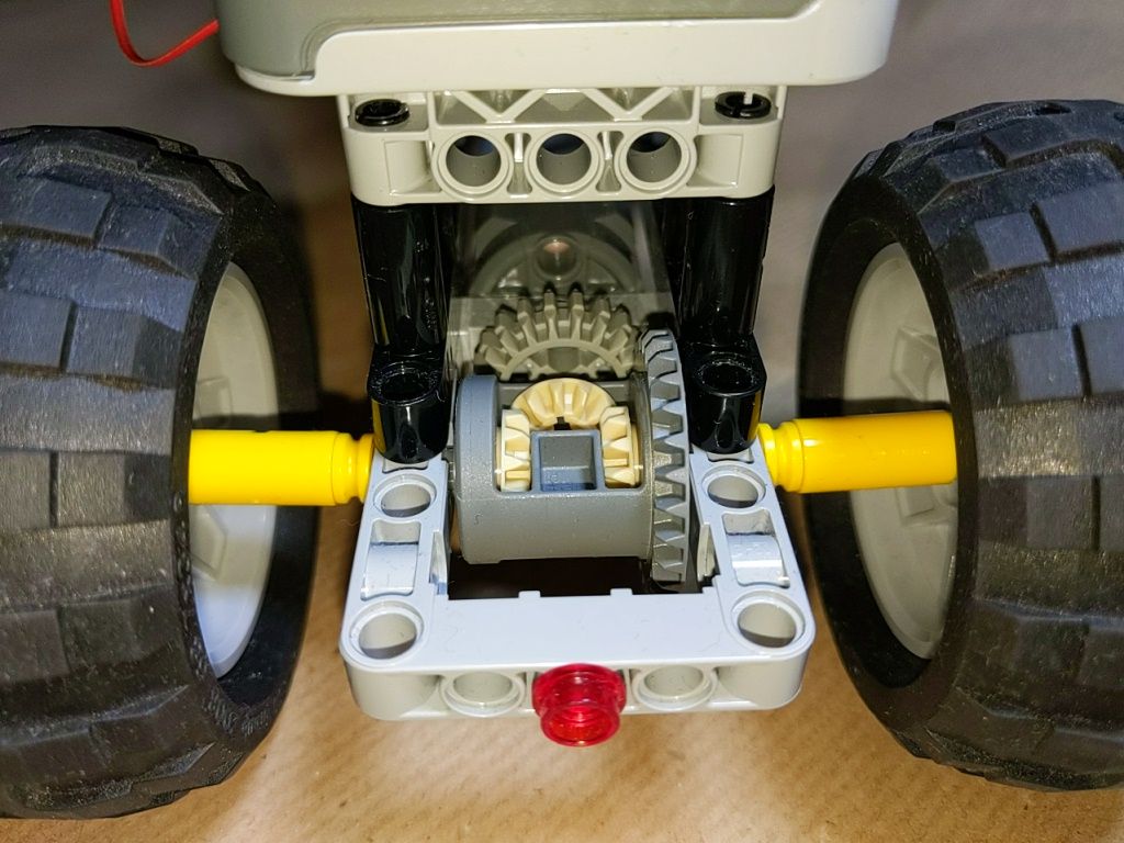 Der Lego M-Motor treibt über ein Zahnrad ein Differenzial an, das mit den beiden Hinterrädern verbunden ist. Durch das Differenzial werden die ungleichen Fahrwege links und rechts bei Kurven ausgeglichen.