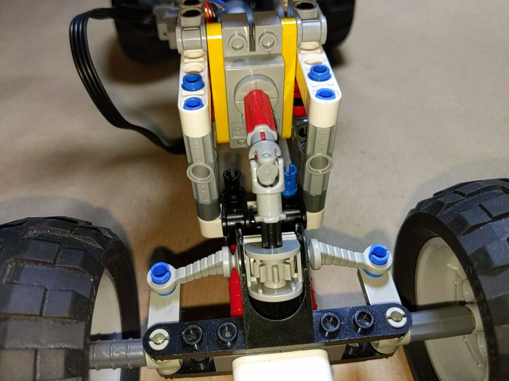 Verwendet wird eine alte Lego-Lenkung (Teile 2790, 2791 und 2792), deren Achse mit einem Geekservo verbunden ist.